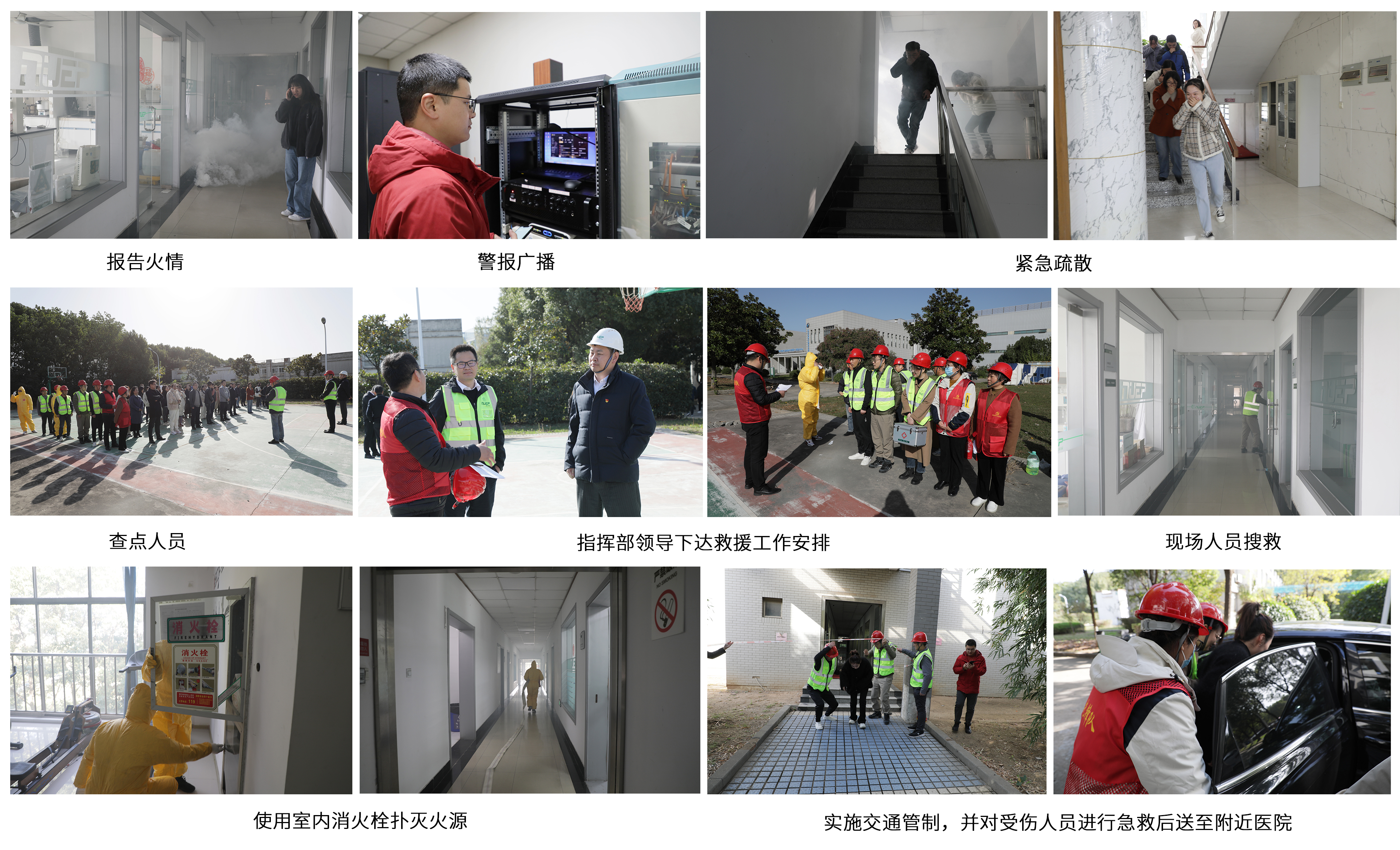 上午9:30分,模擬辦公樓三層實驗室突發火情,火災呈現蔓延趨勢,接到險情報告后,指揮部迅速啟動應急預案,各應急小組從火警廣播、人員疏散、人員救援、火災撲救等全流程、全環節進行“模擬實戰”。9點32分,各部門人員按照疏散路線、采用合理動作有序撤離辦公樓并在指定安全地點集結;9點33分,應急隊伍緊急集合完畢,并進入現場開展交通警戒、人員搜救和火災撲救等行動;9:45分,現場火勢撲滅,應急隊伍返回集結點并向指揮部匯報應急救援結果。